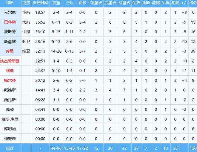 时隔五场比赛,库里重新披挂上阵,投篮28中14,其中三分15中6独揽39分5板5助,可惜难救主,勇士120-127不敌森林狼,战绩来到13胜13负排名西部第八。